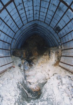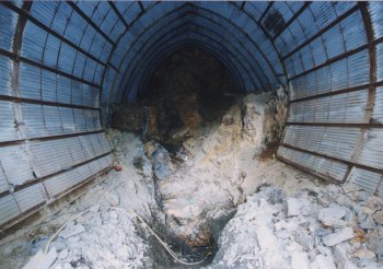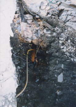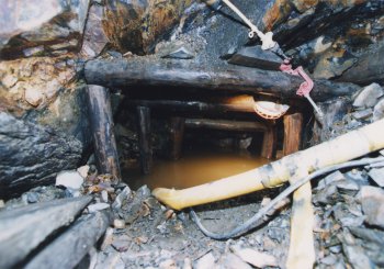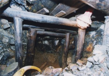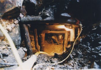 現在の大きい坑道での作業の時、旧抗が現れ、坑木も姿を見せます。ほとんどが落盤していますが、岩盤のしっかりしている場所は昔の姿を残しています。このような所にこそ良い原石が含まれているのです。 |