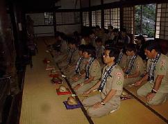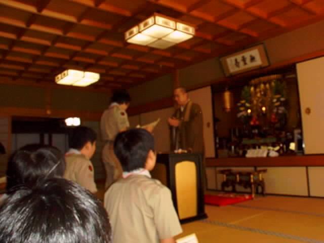 | 結団式 慈教殿で、結団式を行いました。 数珠と袈裟をいただき、これからの日程、諸注意を受けました。みんな、緊張しています。 |