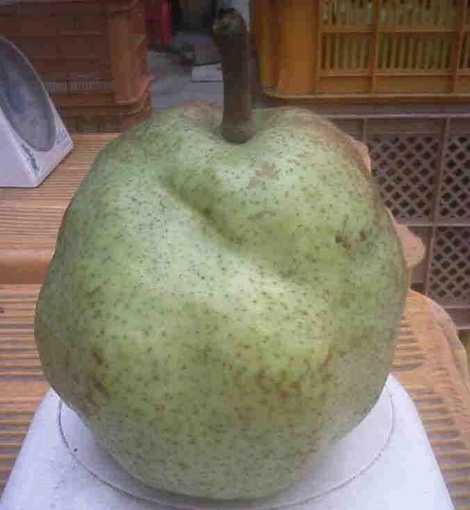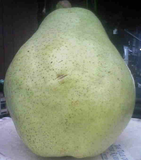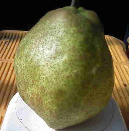 2007年10月19日 渋崎園 ラフランス (20世紀へ高接ぎ) 通常250g程度の品種ですが今年は大玉でした。これは600gも!シルバーベルのようです。 |