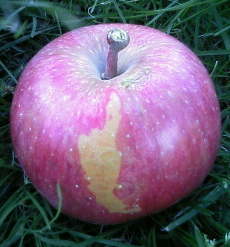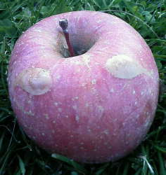 2008年11月12日 渋崎園 サンふじ 通常は摘果作業で落としてしまう品質のものですが、残っていました。芯室まで穴が貫通しています。 |