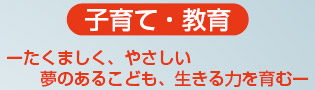 | 大きな社会環境の変化の中では、子育て、教育の在り方も変えていかなくてはなりません。福祉と教育の垣根を超えて家庭、学校、地域、行政が一体となり先進的な取り組みを進めます。 ○どんぐりプランの推進 ○(仮)こども部の設置 |
