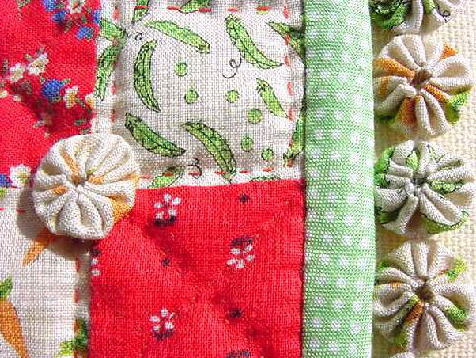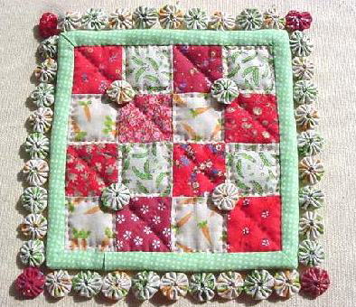 春らしい小さなキルトを作り、 周りをヨーヨーで飾ってみました。 お野菜柄、 エンドマメとニンジンがキュート♪ これ、ヨーヨーの直径は 1.4センチです。 かなり小さいの。 小さい……って、それだけで 可愛い気がする。 16センチ×16センチ |