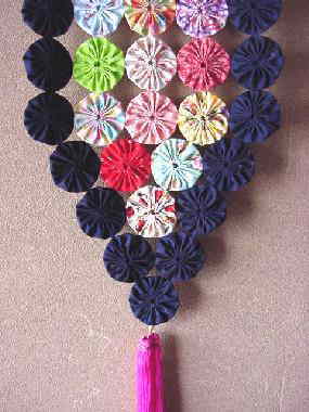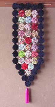ヨーヨーキルトのミニタペストリーを 作ってみました。 ヨーヨーの直系は、約5センチ。 ひとつの円が大きめなので、 存在感たっぷりです。 裾部分には、房飾りもつけました。 これはけっこう気に入ったので、 同じタイプでいくつか作ってみたいと 思っています。 幅25センチ×丈80センチ |