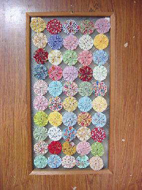 私の部屋のドアには、 灯りとりのガラスがはまっています。 あまりに光を通してしまうので ヨーヨーキルトで小さなカーテンを 作りました。 幅25センチ×長さ52センチ ヨーヨー、約5センチ |