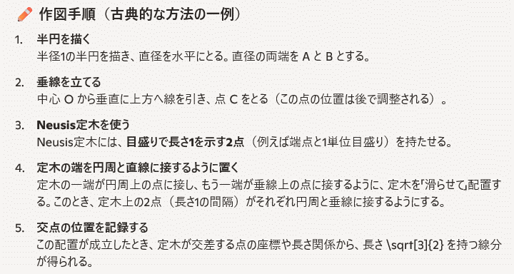 定木とコンパスでは作図できない2の立方根を作図する手段として、Neusis作図と呼ばれる、定規に目盛りが2ヶ所しるされている道具を使う方法を調べてみています。AIに尋ねてみたらいい加減な答えを返してきました。