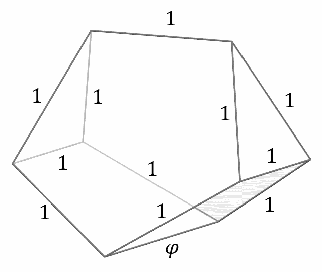稜の長さが1本だけ違う正五角形×2,正三角形×2,等脚台形×2の多面体のつづきです。