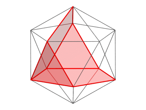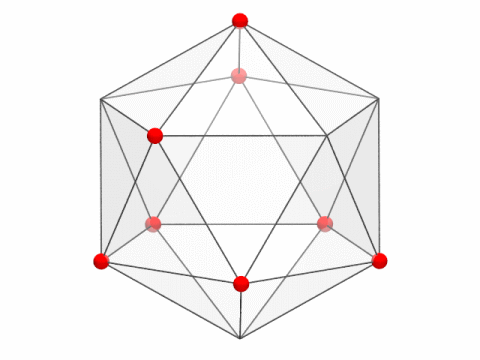 正二十面体の12の頂点のうちの8つ ひとつずつ面を張ってゆくアニメーションと、外側の正二十面体の骨格と一緒に六面体を回転させてみるアニメーションファイルを作ってみました。それぞれ下の画像をクリックすると別窓で開きます。