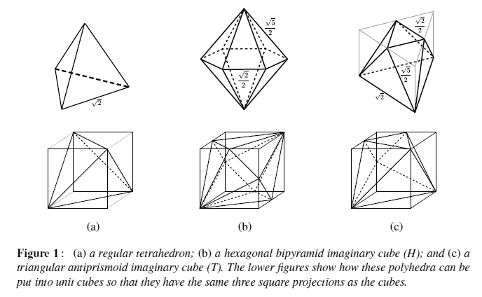 Fig.1 of above paper イマジナリーキューブというのは三面図のシルエットがいずれも同じ大きさの正方形になっているような多面体で、上記の論文の著者の立木秀樹先生が使われている呼称のようです。詳しくはこちらのイマジナリーキューブパズル 3H=6Tというページを見ていただきたいのですけれども、イマジナリーキューブのうち、上の図の(b)と(c)の2つのタイプのものをそれぞれHとTと名付けられています。HもTも単位立方体に内接する多面体なのですが、1辺の長さが2の立方体を考えたとき、単位立方体に内接するTやHが合わせて8個、2×2×2の立方体に収めることができるのは自明です。イマジナリーキューブパズル3H=6Tというのは、一辺が2の二倍体の立方体にH3個とT6個のあわせて9個をうまく入れてください、という隙間のある三次元の箱詰めパズルなのです。