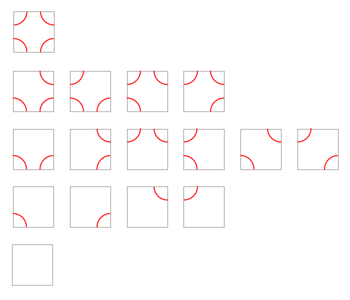 図のように正方形のパネルの四隅に4分の1の円周を描きます。4つの角に円周があったりなかったりするので、ピースは24で16通り作れます。回転は許されません。この16枚のピースを4×4に配置して、大きな正方形を作ります。そのとき、隣接するピースの角の円周の有無はそろっていなければいけません。言い換えると、大きな正方形の内部で赤い円弧が途切れてはいけません。マッチングパズルのルールです。
