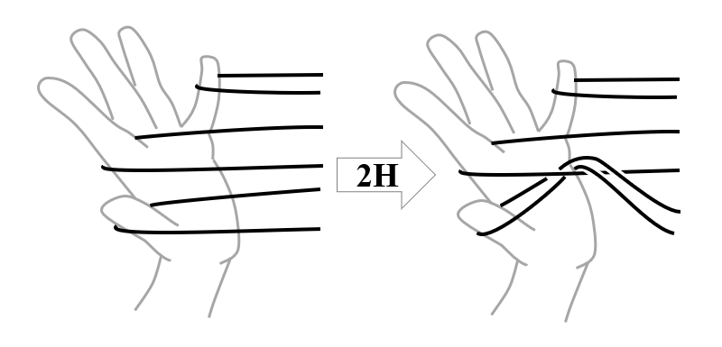 2H:親指の輪をつまんで外し,人差し指の輪に上から下に通して親指に掛け直す 私自身が最初にシャーマン氏の論文を見ながら取ろうとしたときに苦労した箇所でもあります。もともとの論文には上のような図はなく、シャーマン氏の表記法で下のように表記され、英語の自然言語表記で[Thread thumb loops down through index loops and replace]. と補足説明されています。