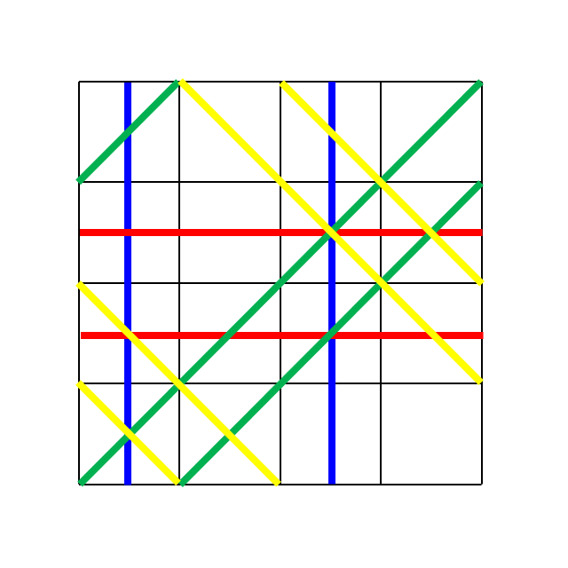 正方形に水平な赤線、垂直な青線、左下から右上への斜めの緑線、左上から右下への斜めの黄色線を引いたピースを考えます。