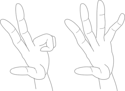 - 人差し指を向こうへ半回転ひねる
