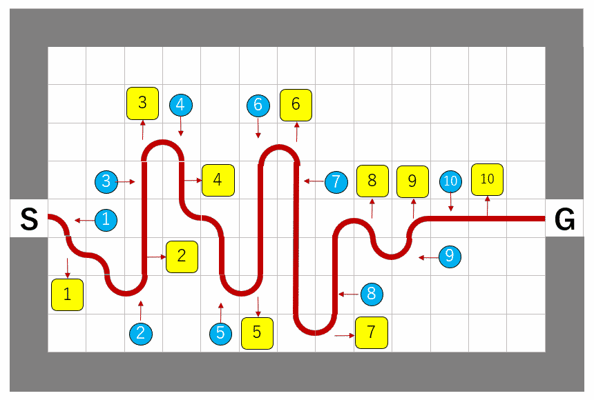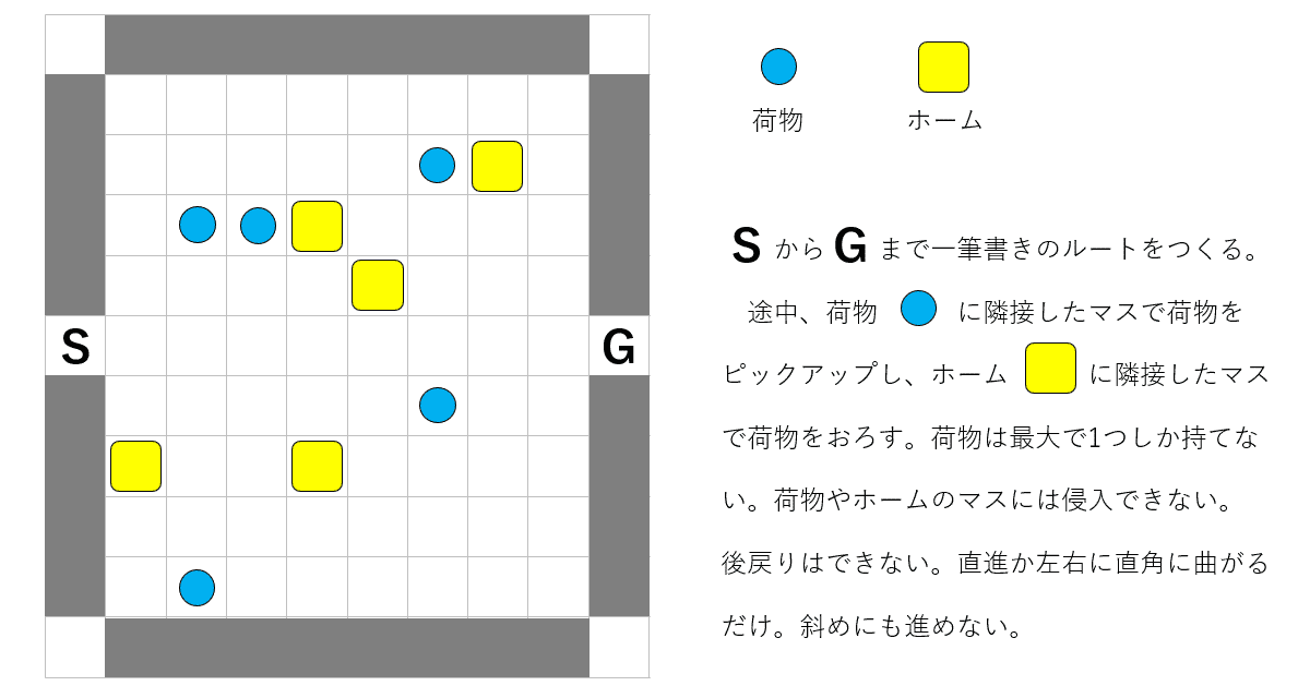また、同じ経路長であれば「pickしてからplaceするまでの距離(=荷物を持って移動するマスの数)が少ないほど省エネルギーで好ましい」という指標も考えられるかもしれません。最適化指標をいろいろ考えて、その指標で経路を評価して比べると……とか考えてしまいましたが、職業病かもしれません。