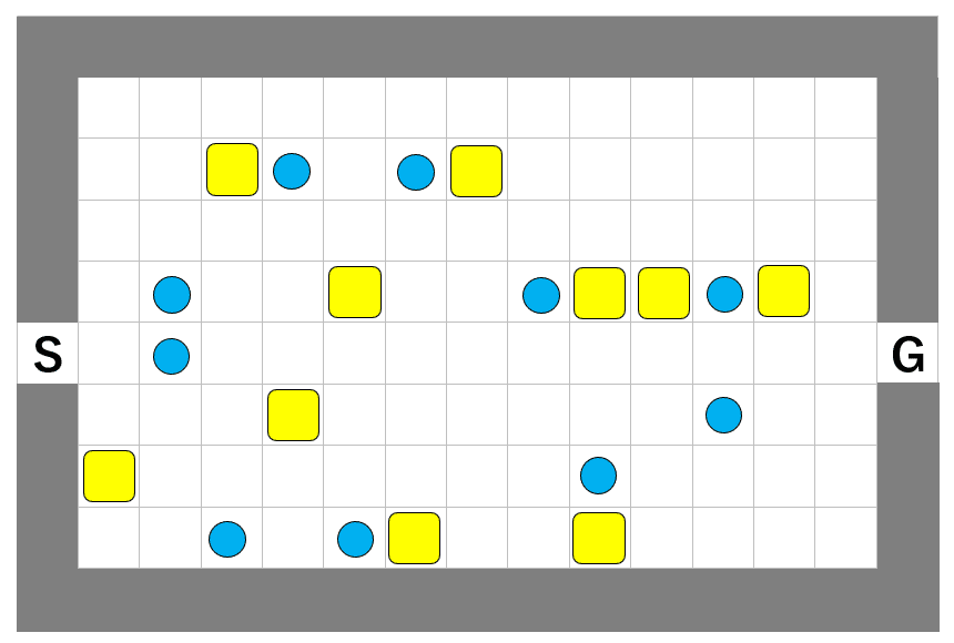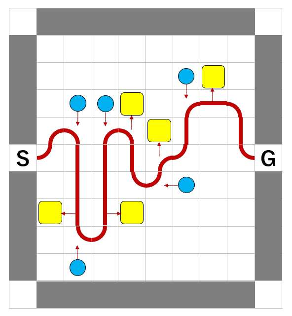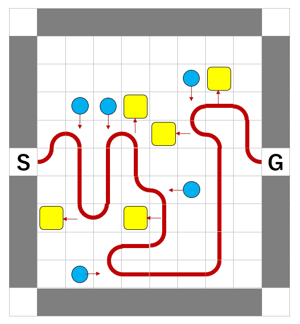 論文のFig.6(細長い盤面の例) とりあえず1つは解を見つけました(こちら 別窓で開きます)。スタート直後のマスに隣接する荷物はその時点で取るべきでしょうか。スタート直後、上に進むべきでしょうか下に進むべきでしょうか。どちらも解があるような気がしないでもないですが片方しか確認できていません。