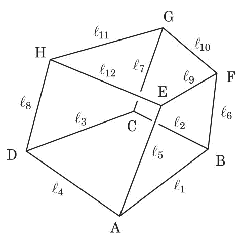 先日来、面と頂点と稜(辺)の数が立方体と同じで、12本の稜のうち1本だけ長さが異なるものの話をしています。下図右のような多面体グラフで表されるかたちで条件を満たすものがある、というのをご紹介して、