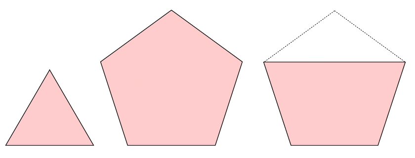 図 2 ということは、この六面体の等脚台形は正五角形の対角線で三角形を切り落としたかたちなのです(図3右)。