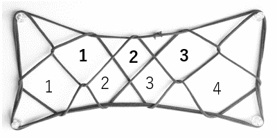 ダイヤ型の数 最初の「1回転ひねったはじめの構え」の中央の糸の絡みが、完成形の中央の上の辺の絡み(上の段の2のダイヤ型の上の頂点)になっています。実に巧妙で美しいデザインで、感心して何度も取ってみて楽しんでいます。