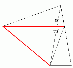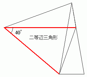 上の図の2つの赤い線の長さも同じ、ということになります。この二等辺三角形は、頂角が60-20=40°になります。