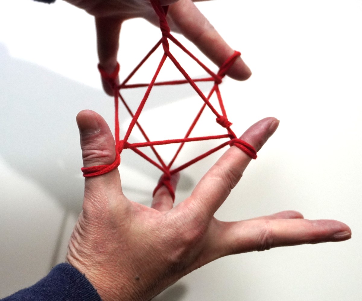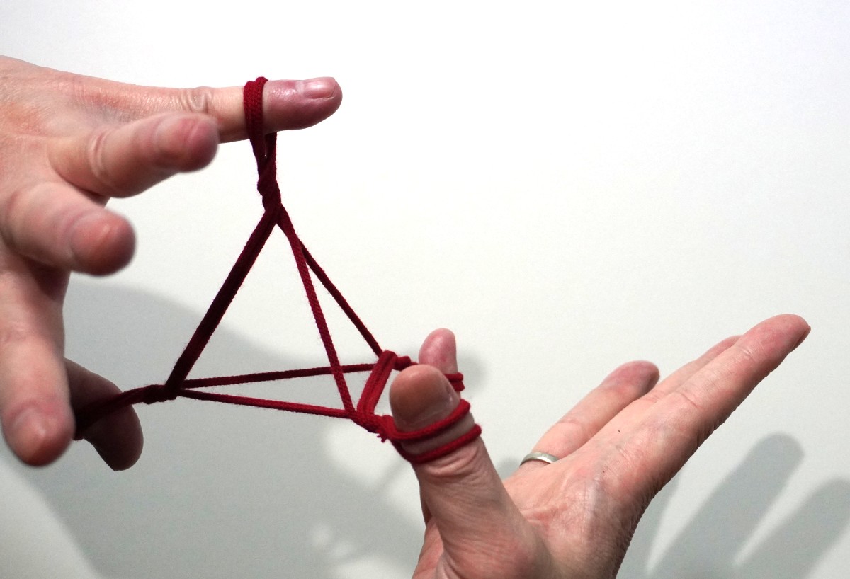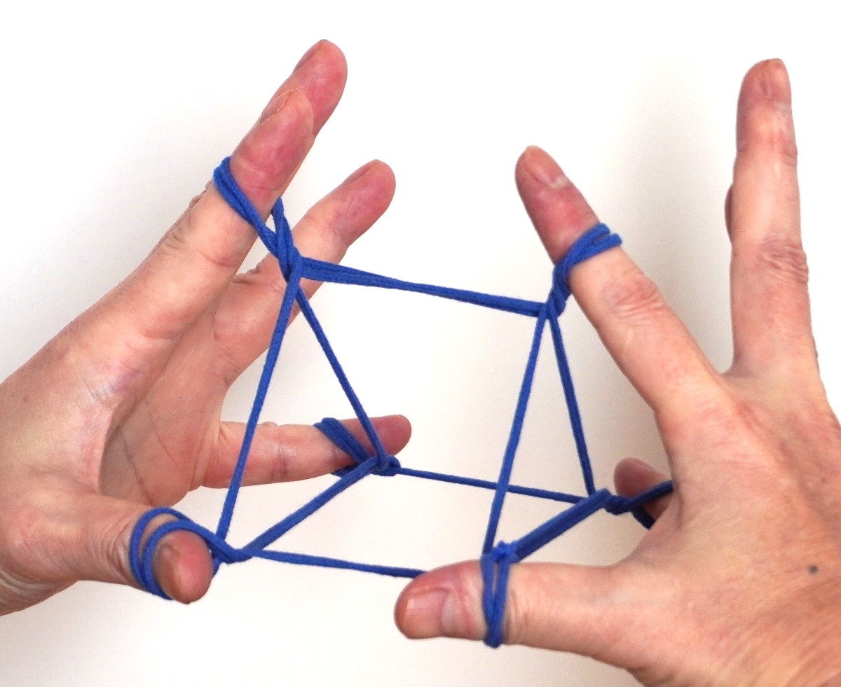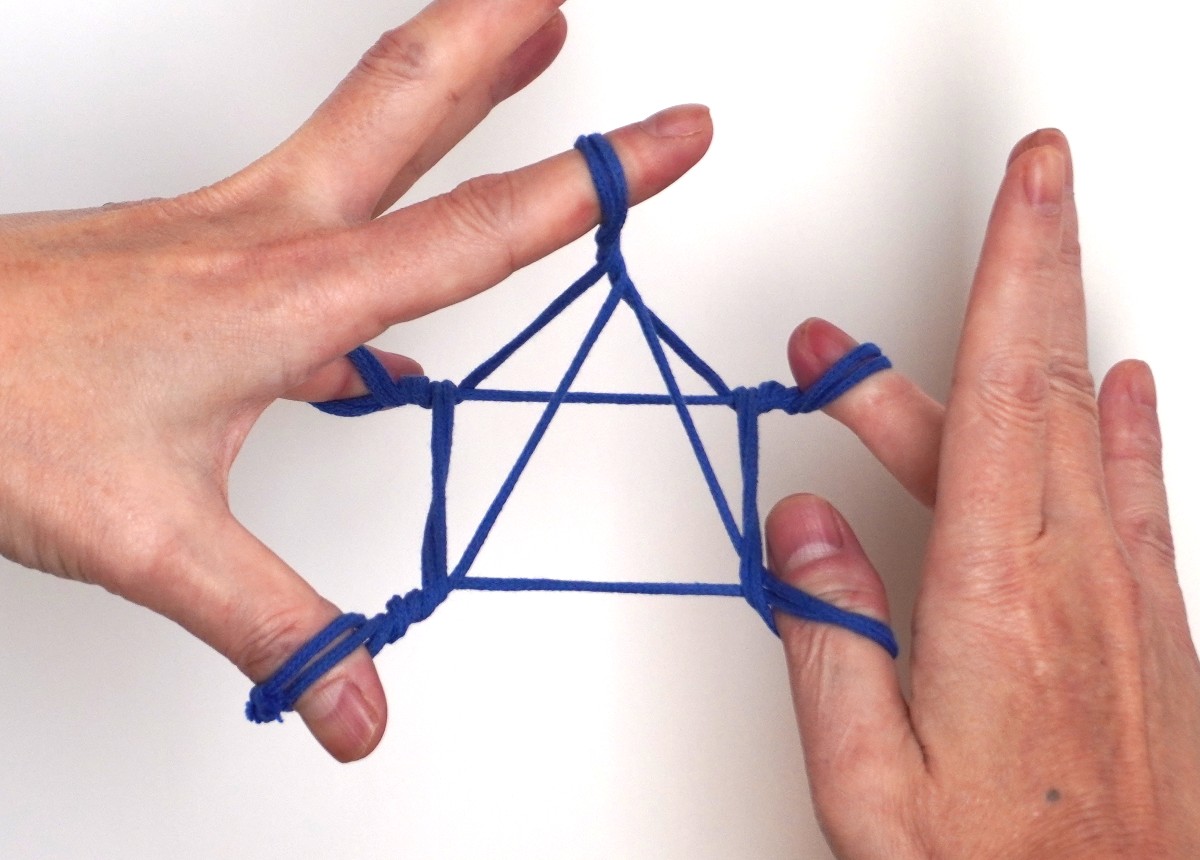 (2025年4月号:通巻762号)2025年度は立体的な作品をご紹介することにしました。この回から3回続けて多面体の作品のご紹介です。今回は多面体の1つの頂点を1本の指が担当するという発想で作った作品のご紹介です。国際あやとり協会に先行文献がありますが、各指の糸を1回転ひねってみたのが自分が追加した工夫です。 作品ごとに自分の手の大きさに合った長さのあやとり紐を選ぶのがコツです。