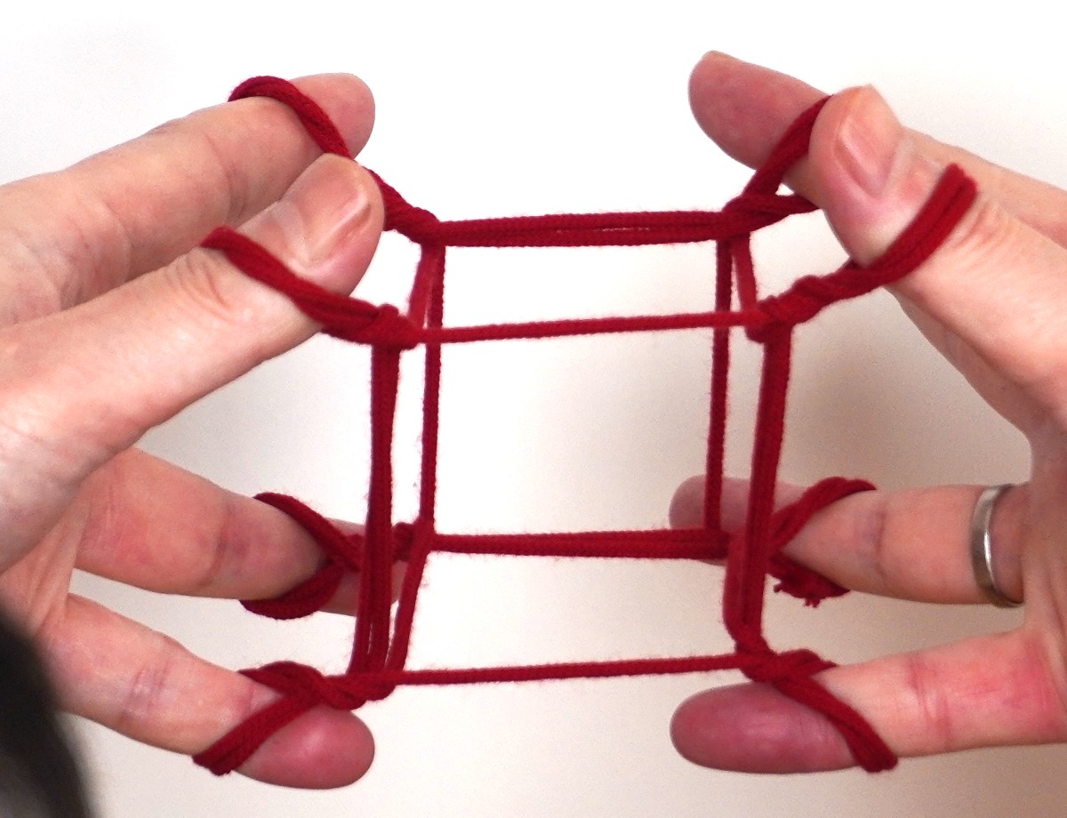 立方体 8つの頂点を左右の4本ずつの指で引っ張ります。全ての面が正方形になるようにするのはかなり大変です。