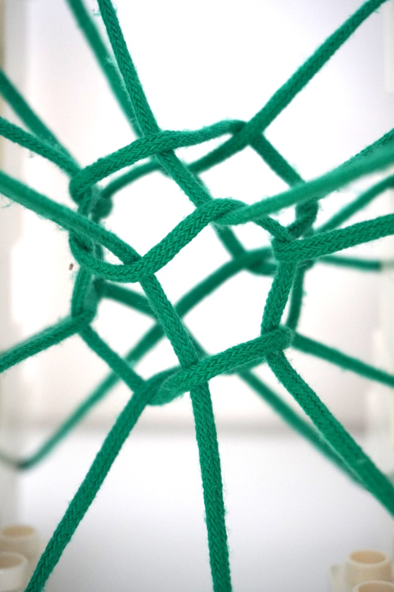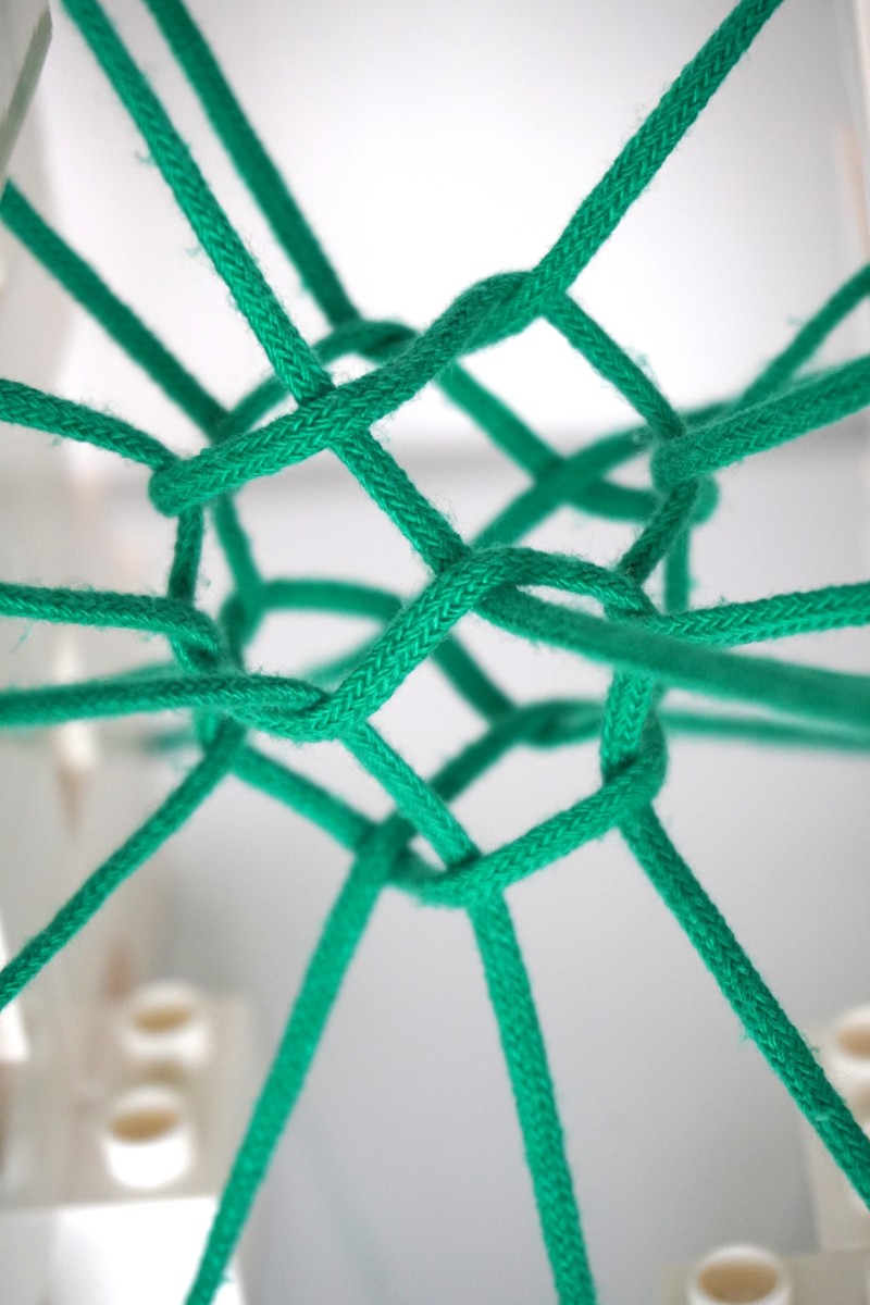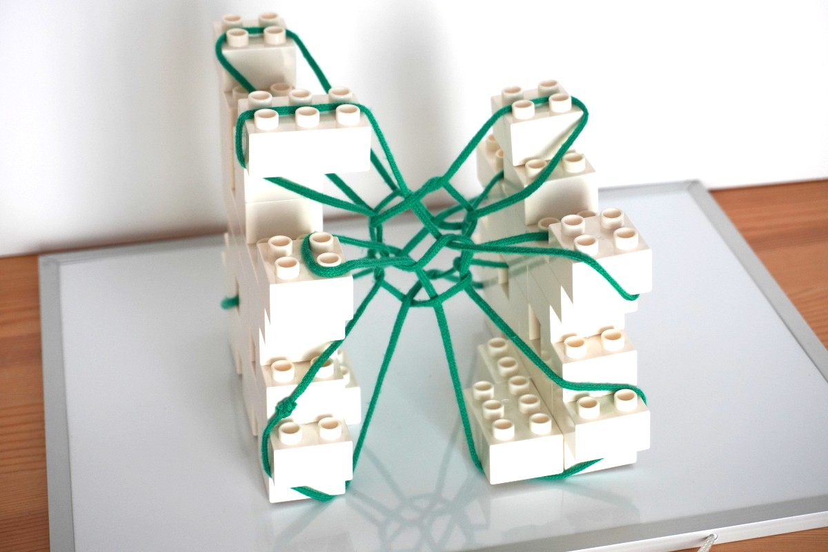 うまく整えれば正十二面体になるはずの構造です。正十二面体は頂点が20あります。(正二十面体と双対関係です。)このあやとり作品は、10本の指にかかるそれぞれの指の輪の両側の糸が正十二面体の2つの頂点を形作ります。両手の10本の指がふさがっているので自分があやとりを取った状態では調整ができません。下の写真のように、デュプロブロックを組んであやとりを掛けてなんとか正十二面体に近づけるように頑張ってみました。デュプロブロックには磁石を仕込んで白いマグネットボードに貼り付けてあります。位置の微調整をするのに都合が良いのです。