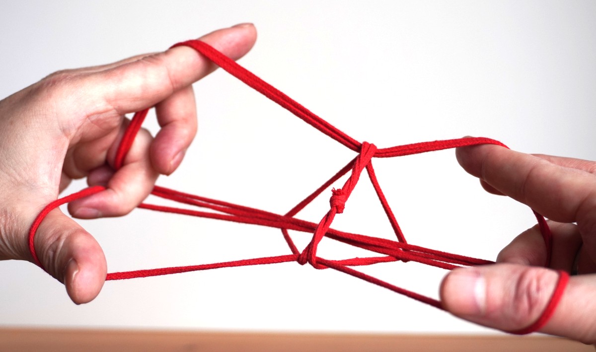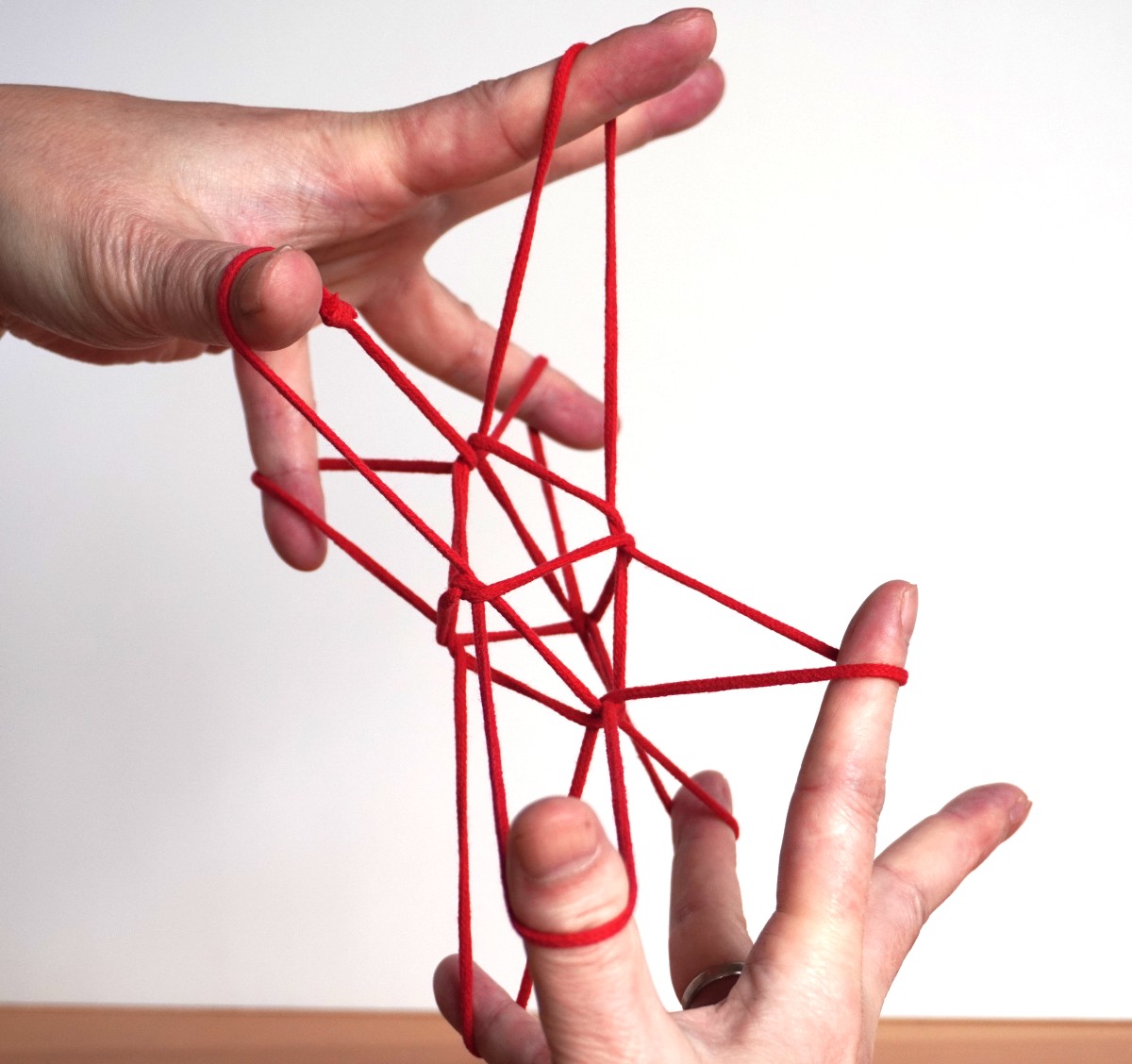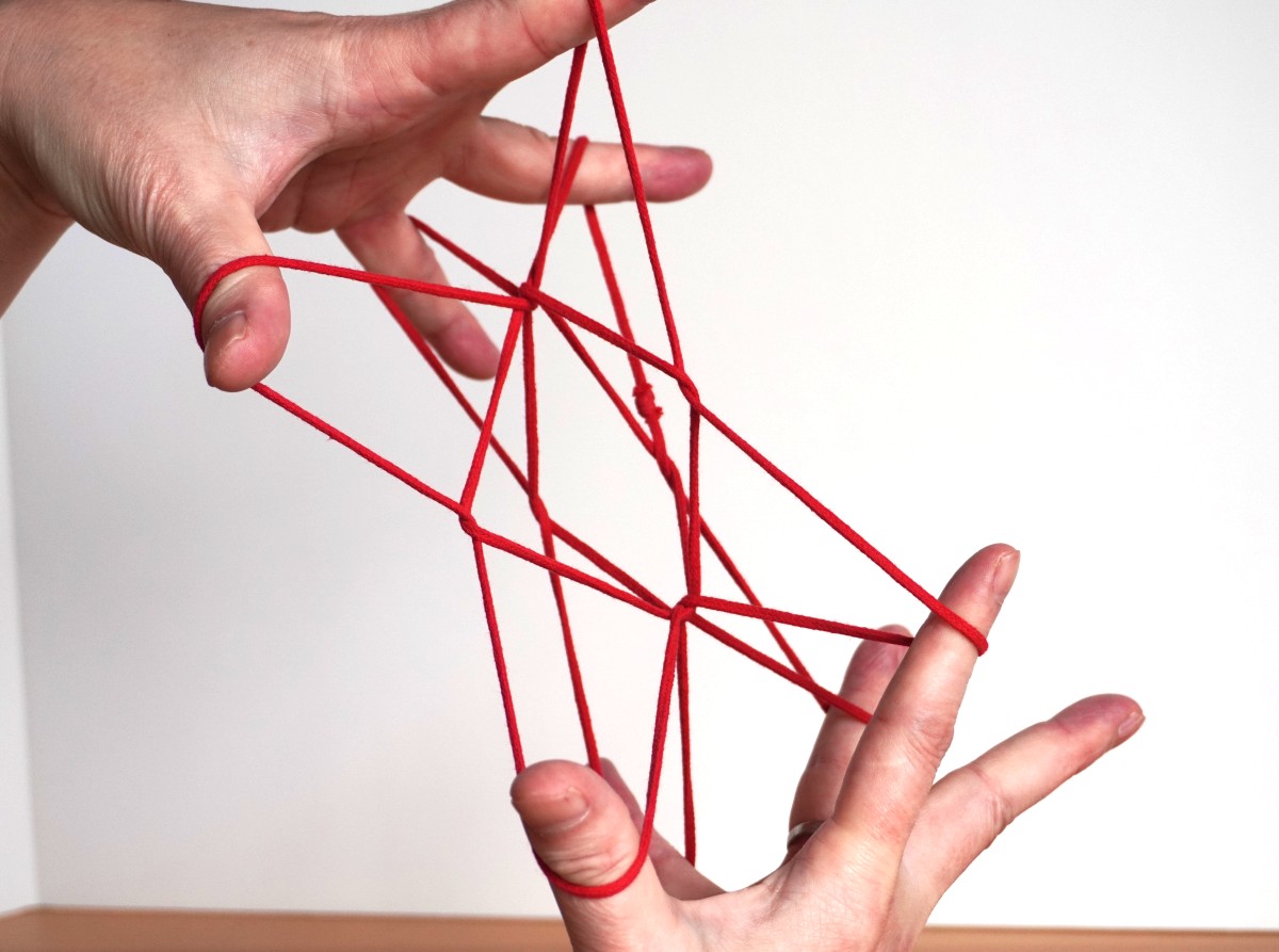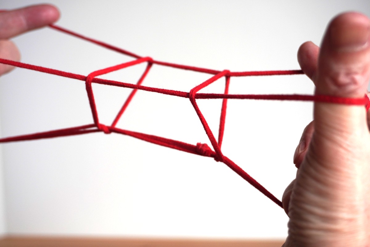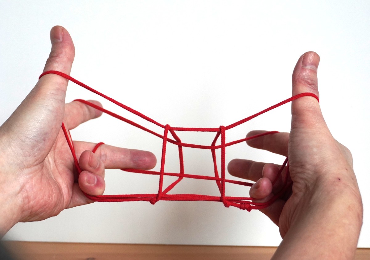シシドの立方体 シシドさんはまずこのような立方体の手順を紹介しています。4月号(2カ月前)でご紹介した立方体と違って、左右の手を横切る4本の水平な糸に正方形の輪が2つ、立方体の側面として掛かっているかたちをしています。両手の間に目的のかたちが作られているのが「あやとりっぽい」です。かたちを整えるのは正直かなり大変ですが、これをデザインされたのはすばらしいと思います。