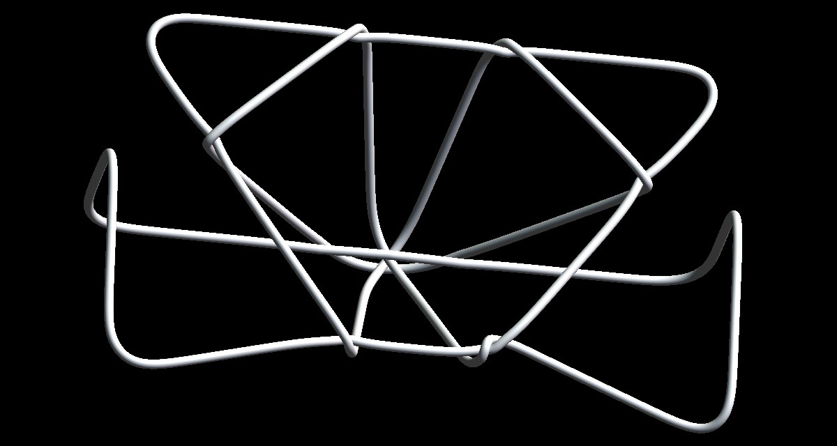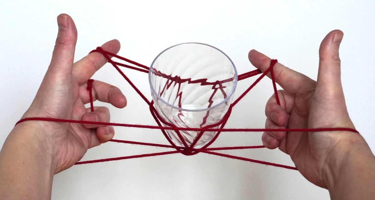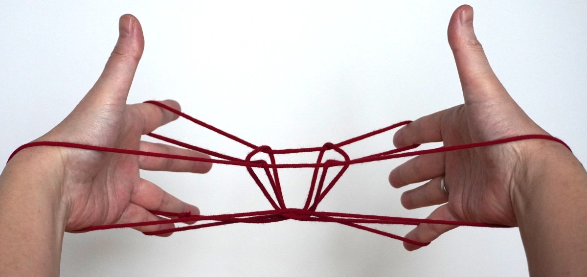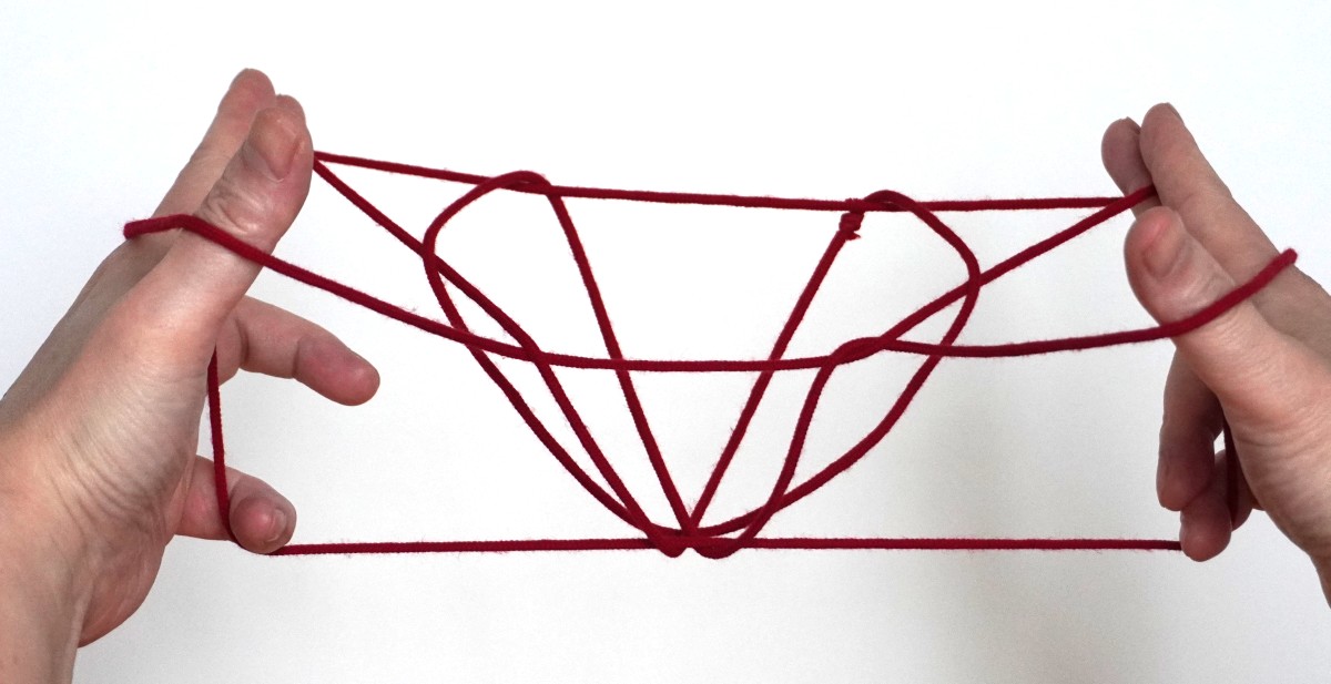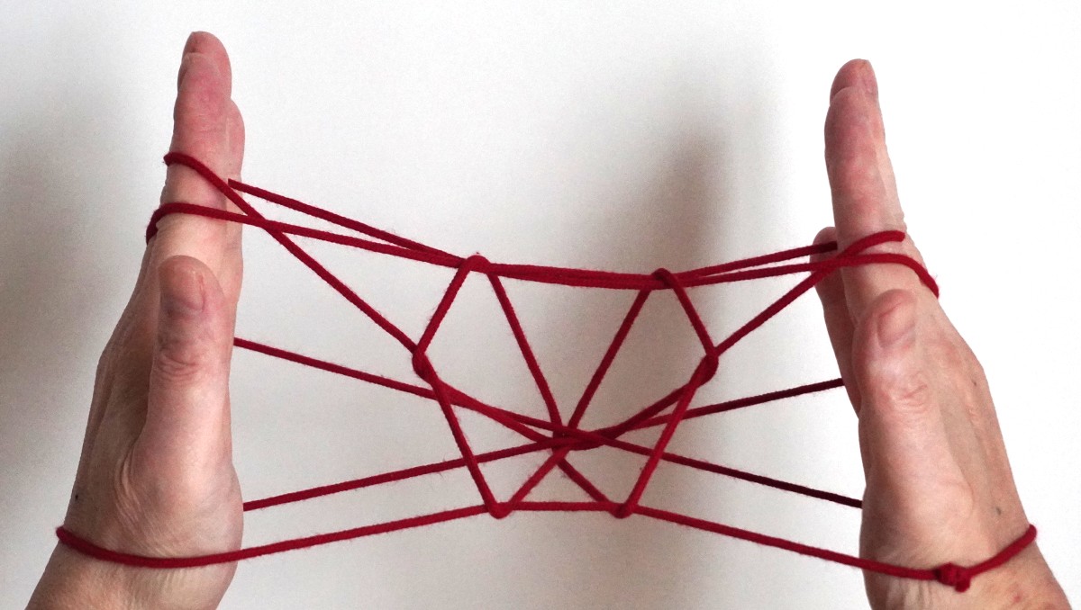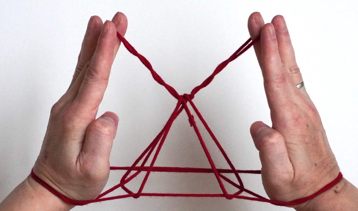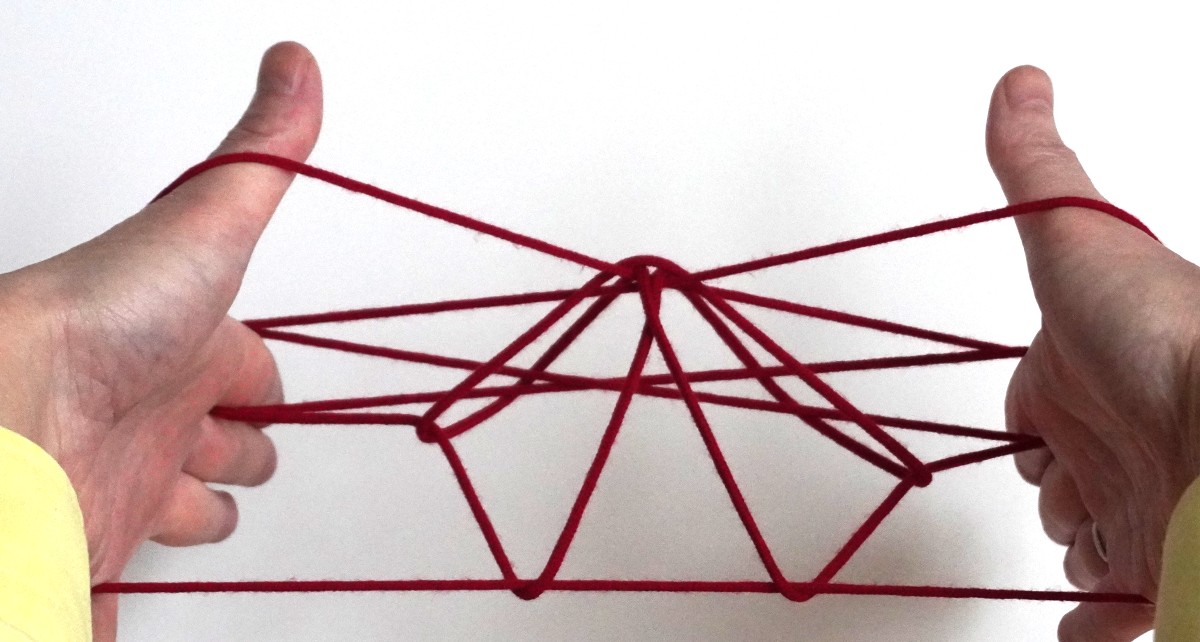 「火山」(パタゴニア) 上2つは「鳥の巣」でおわん型(下に凸)の六角錐でしたが、これは「山」なので上に凸です。あやとり作品としては山の頂点をどうやって支えるかが問題になりますが、これは両手の中指(一番長い指)の先端で引き上げるデザインになっています。ただ引き上げるのではなく、それが火山の噴煙であると解釈することで無駄がなく全体が見事な造形になっています。素晴らしい作品だと思います。