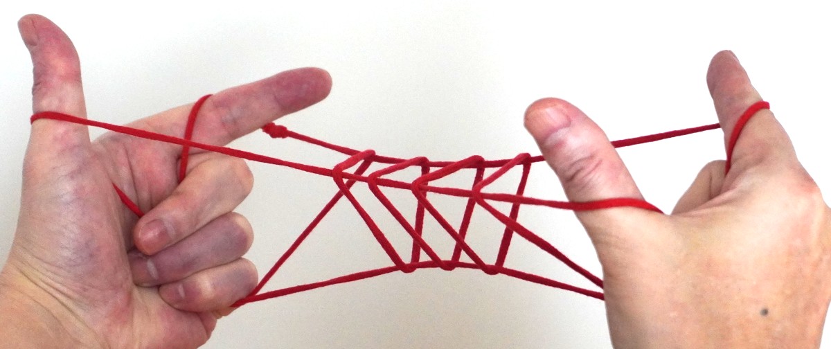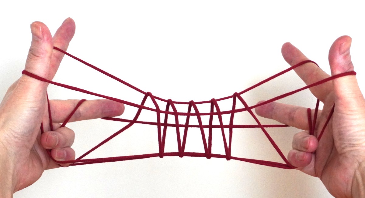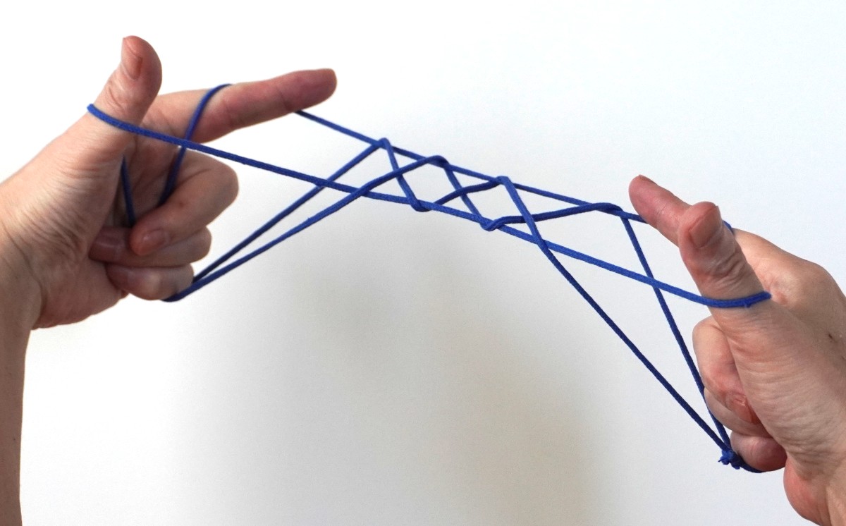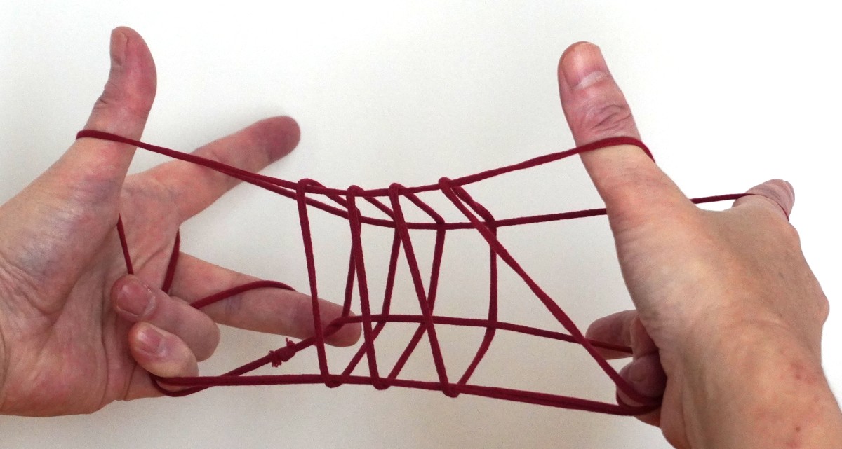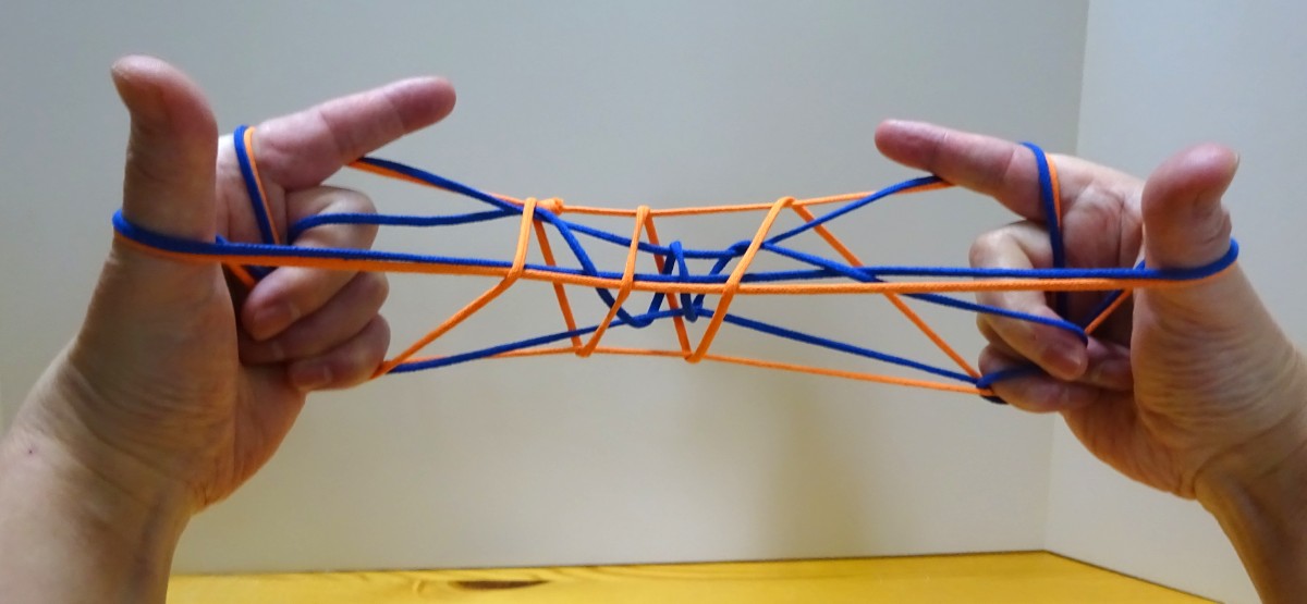 アタヌアの家(マルケサス諸島) シシドさんの作品は、普通に「人差し指の構え」から始めてそれぞれの輪の糸を取ってゆくという典型的なあやとりの手順の組み合わせで取ることができるのですが、この「アタヌアの家」はそれとはまったく異なる手順で作ります。極めて合理的な手順ですがこの完成形ならではの手順です。最初に片手の手首に糸を巻き付けて(その巻き数が完成形のらせんの巻き数になる)、続いて左右の手を横切る糸を手の甲に巻き付けて準備する、という操作をします。