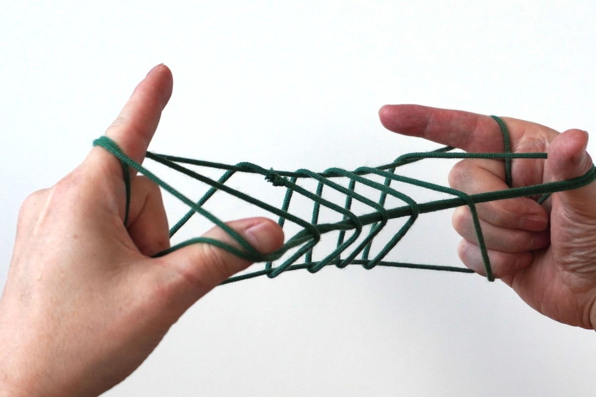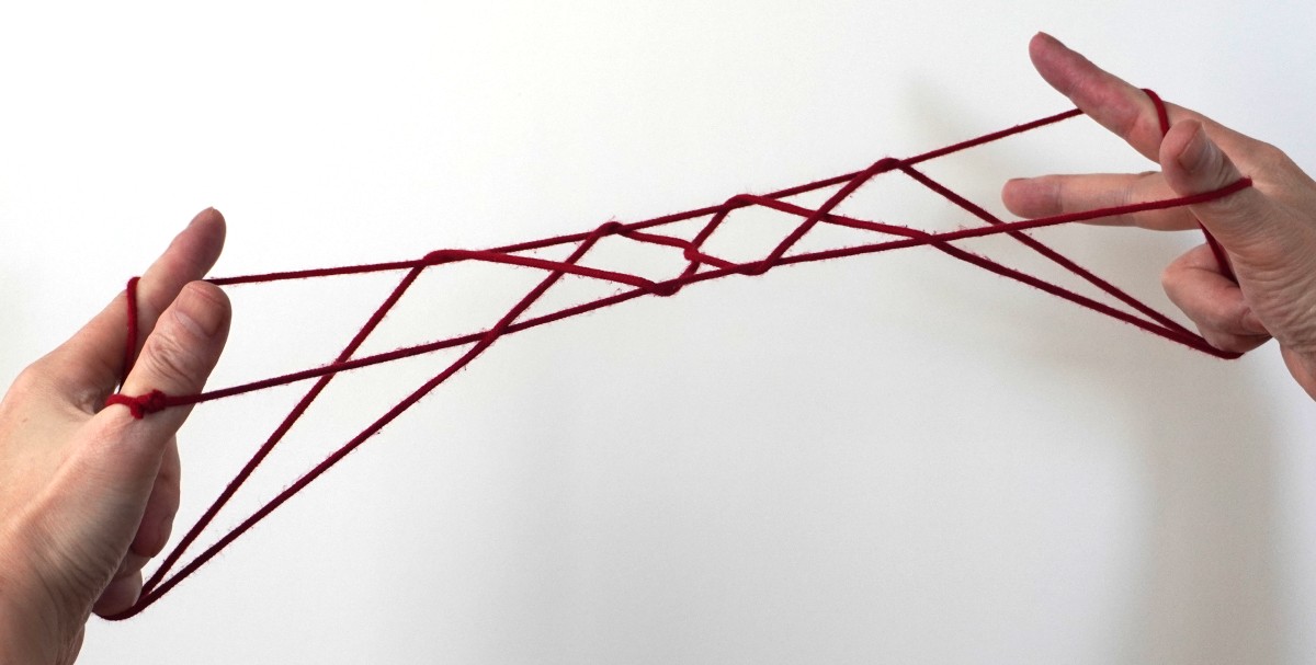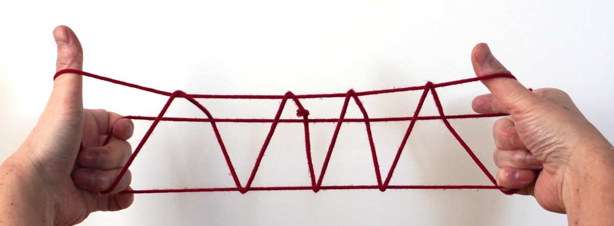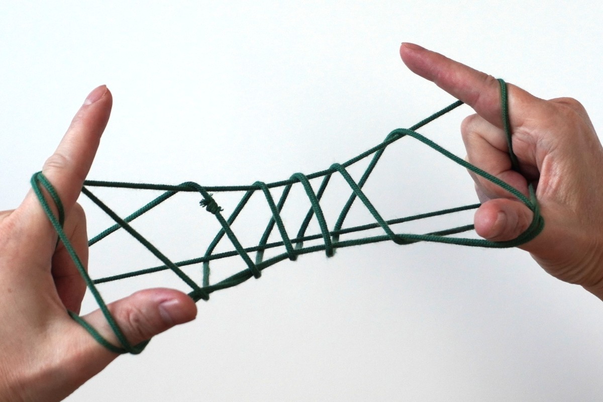 アタヌアの家(マルケサス諸島) シシドさんの作品は、普通に「人差し指の構え」から始めてそれぞれの輪の糸を取ってゆくという典型的なあやとりの手順の組み合わせで取ることができるのですが、この「アタヌアの家」はそれとはまったく異なる手順で作ります。極めて合理的な手順ですがこの完成形ならではの手順です。最初に片手の手首に糸を巻き付けて(その巻き数が完成形のらせんの巻き数になる)、続いて左右の手を横切る糸を手の甲に巻き付けて準備する、という操作をします。