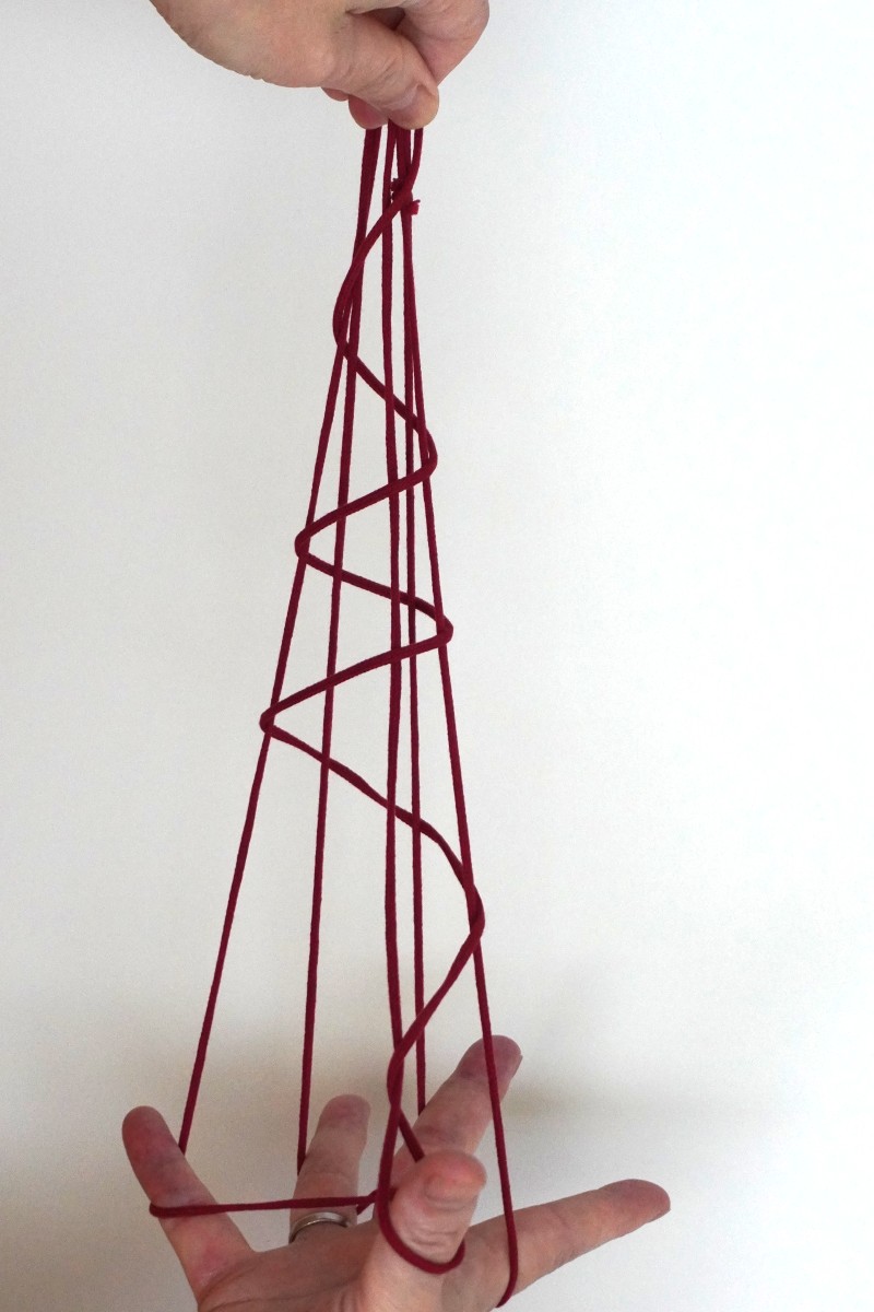 螺旋の五角錐:シシドユキオ 螺旋(II)を縦にして、二重になっていた小指で押さえていた糸を分けて5本にして片側を絞ったかたちです。いろいろなあやとり作品の片側を絞って縦にした「東京タワー」とか「スカイツリー」と名付けられた作品を見かけますが、1981年に発表されているこのシシドユキオさんの「螺旋の五角錐」が特に素晴らしいと思っています。