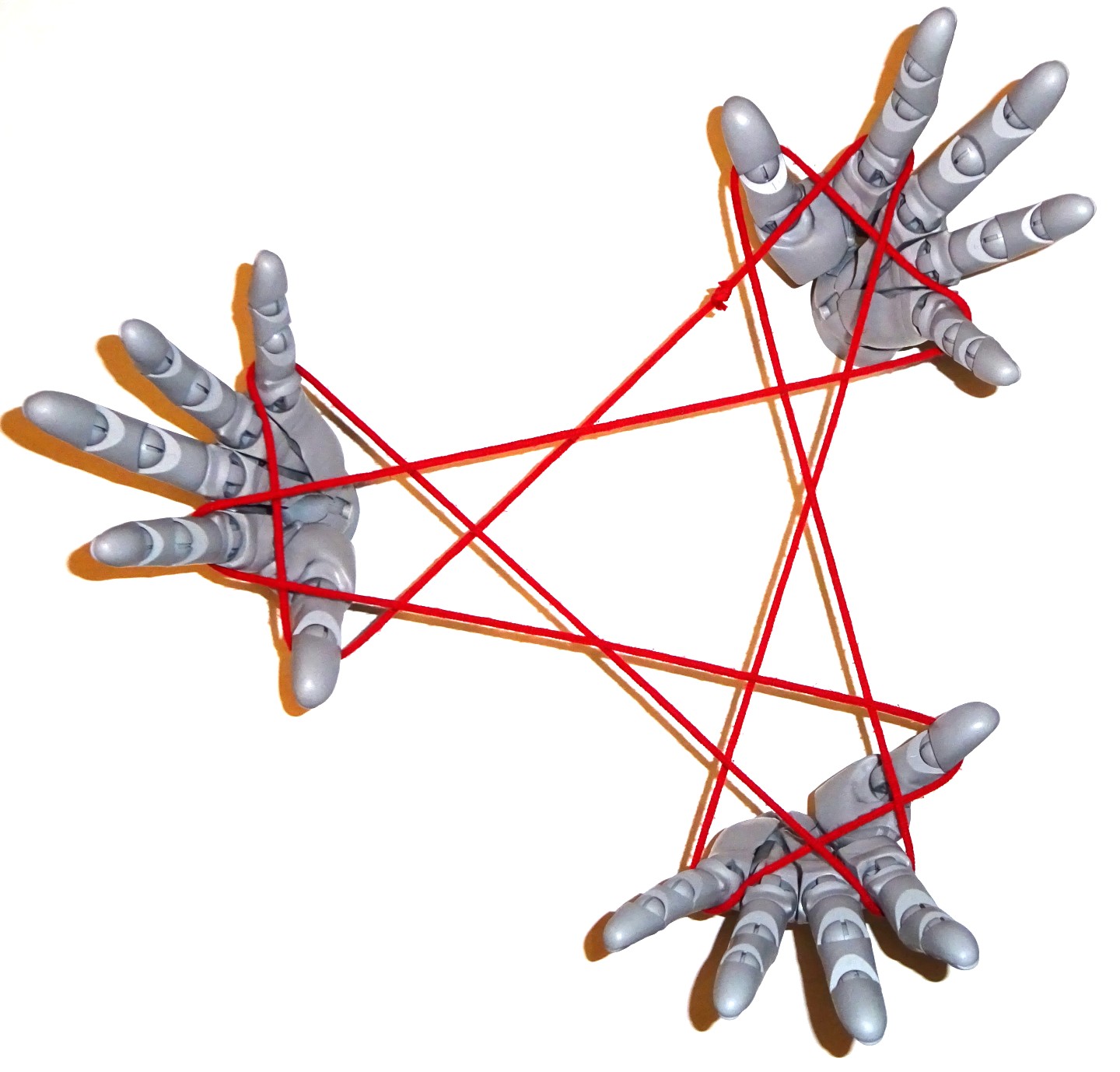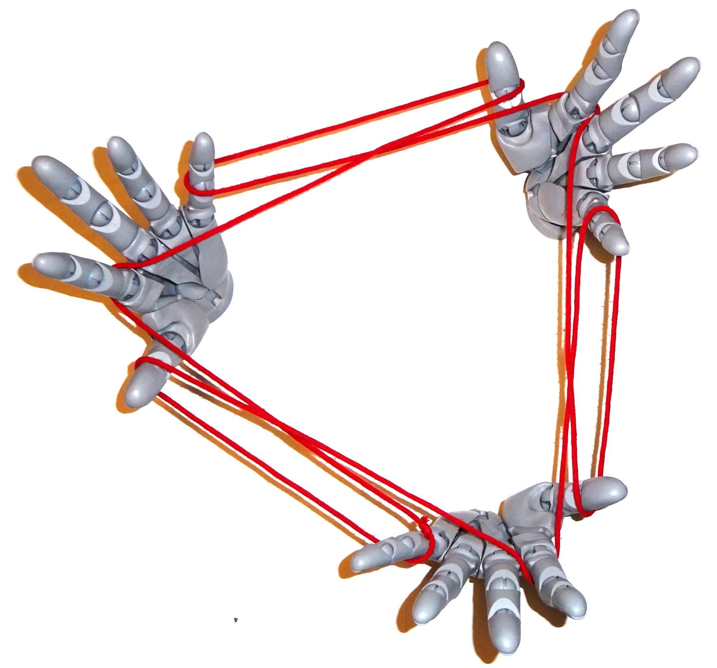 対称性重視なので、「一人の両手(右手と左手)+二人目の片手」ではなく、3人が同じ側の手を提供して取る前提で考察しています。本文中ではあまり考察できていませんが、「全員が左手を提供する」ことにして、いろいろな説明をしています。なぜ右手ではなくて左手なのかというと、自分自身の手をモデルにして写真を撮るとき、世の中のカメラ製品はシャッターを切るのは右手でないととてもやりにくいのです。もちろんリモートスイッチを用意したり、PCと連携してPCから制御したり、いろいろな手段はあります。また、撮影後に画像を左右反転するという方法もあります。 でも、ふと思いついたことを左手でやってみてそれを右手で写真を撮る、というのがやりやすかったのと、写真を左右反転すると、自分が欲しいイメージと違っていたりしたため、左手をモデルにすることにしました。取ったあやとり作品を調整したり、何か手で記録を取ったり写真を撮ったりするのに、多くの人の利き手である右手が使えるほうが好ましいのではないか、という思いもあります。