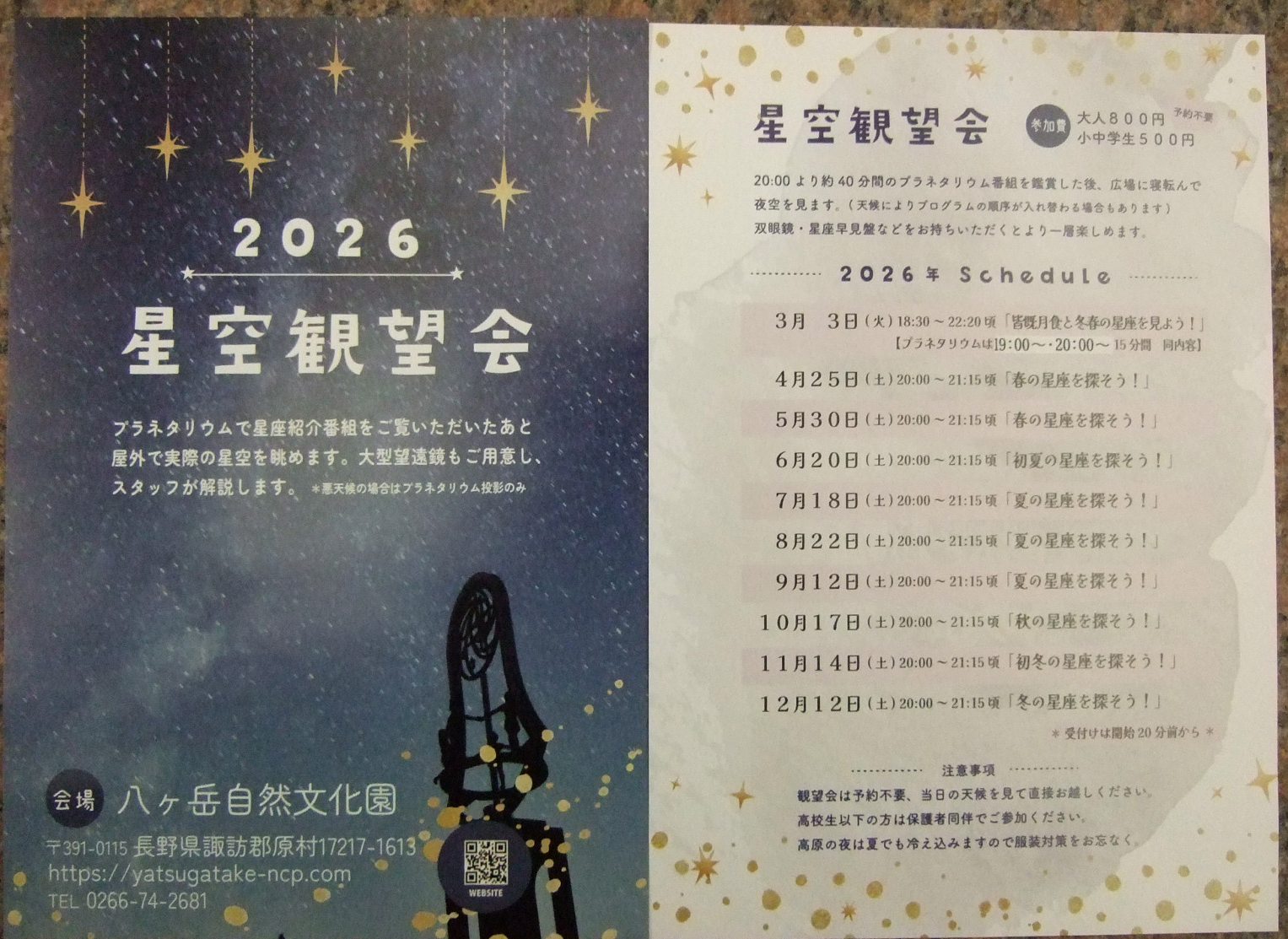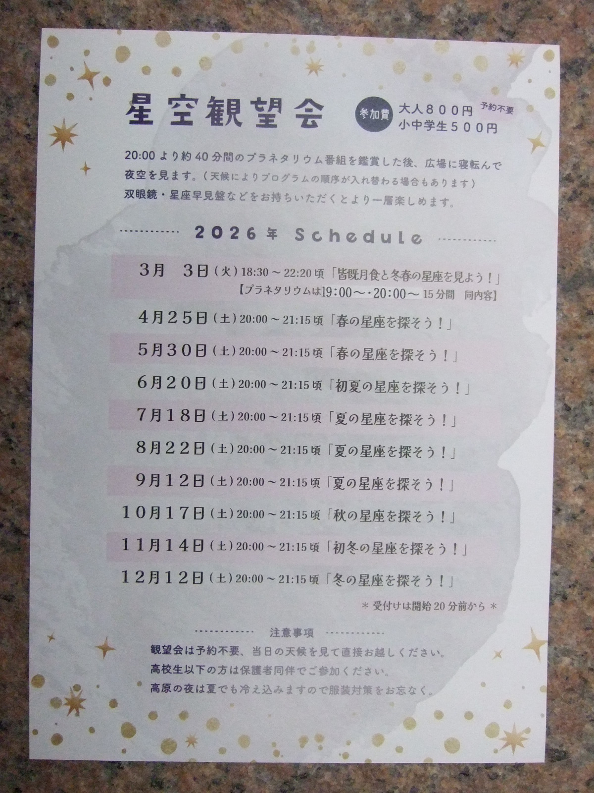 ***「春の星座を探そう!」*** 日 時 : 2026年4月25日(土) 19:45〜受付開始 20:00〜プラネタリウム観覧(約40分) 20:45〜屋外観望 21:30頃に終了。 参加費: 高校生以上 お一人¥800円 :小中学生 お一人¥500円 (ロビー受付にて承ります) 予約不要。(高校生以下は保護者同伴のこと。) 内容 :プラネタリウムで星座紹介番組をご覧いただいたあと、屋外で実際に星空を眺めます。 悪天候の場合は、プラネタリウム投影のみ。 予定 20:00より約40分間のプラネタリウム番組を鑑賞した後、スタッフが設置した望遠鏡などで観望します。 広場でシート等に寝転んで肉眼での星空観望(天然プラネタリウム)。 悪天候の場合は、プラネタリウム投影のみとなります。 ご案内:双眼鏡・望遠鏡・星座早見盤などをお持ちいただくとより一層楽しめます。暖かい服装でお越し下さい。 雨天でも双眼鏡をお持ちください、プラネタリウムで使用すると星空探索の練習にもなります。 ご注意:プラネタリウム上映中はスマホの使用は禁止です、電源をお切りになりバッグなどに仕舞ってください。 お問い合わせ先 〒391-0115長野県諏訪郡原村17217-1613 電話0266−74−2681 FAX0266-74-2395 事務局(八ヶ岳自然文化園内) メール (スパムメール対策のためフォームになりました) |