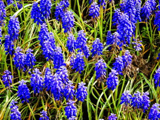 青紫の小花ぶどうの房のようにギュッと集まって咲く、青色がほとんどだが白、ピンクなどさまざまな花色が。