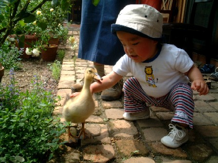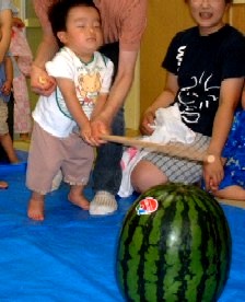 左:05.06.26 カモのひなとふれあい 中:05.07.23 保育園でスイカ割り 右:05.07.23 ヒゲ