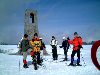 和田村から野々入川沿いの道は除雪され路面は日陰に残る程度。美ヶ原口からビーナスラインに乗り入れ山本小屋に駐車。山本小屋は冬期閉鎖で500m先の美ヶ原高原ホテルでクロカンとスノーシューをレンタル(いずれも3000円)テレマーク2、クロカン2、スノーシュー3の混成チームだ。美しの塔でお決まりの記念撮影。