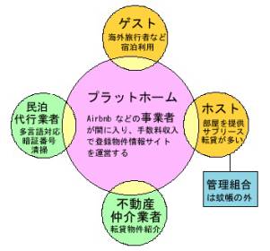 <区分所有マンションでの不安> 一人のオーナーが1棟丸ごと所有している建物であれば、メリット・デメリットを含め、そのオーナーの責任で民泊事業を行うことになります。 しかし区分所有の分譲マンションでは、管理組合の効力は共用部分だけでなく、個人が専有する各部屋に及びますので「自分の部屋をどう使用しようと自由だ」と権利主張することは無理があります。また水面下で行われる有償の民泊は、簡易宿所営業申請の無い「モグリの旅館業」とも言われます。 前述のマンションでは、オートロックが突破され「知合い」と称し特定出来ない人物が出入りしており、迷惑行為・感染症の媒介・犯罪行為の温床など、居住者が不安を抱くのは当然です。 ところが現に居住していない一部の外部オーナーは「賃料さえ確保できれば」と収入を優先し、こうした問題に関わろうとせず、ともすれば管理組合の総会や役員就任を回避しようとする例も見られます。
