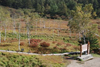 湿原に秋の風が吹いてきました。湿原に賑やかな花の季節が終わると、唐松などの木々が。