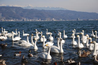 諏訪湖で越冬しているコハクチョが北帰行の季節を