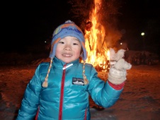 |  | 今年もどんど焼きへ行きました。 息子と同じ位の年齢が少なく、小学生の子供たちが多いので、厄払いのお菓子等の振る舞いでは自力では多く取る事が出来ないが、小学生の子供達から多く分けてもらい、帰りはお菓子の山盛りで大喜びでした。