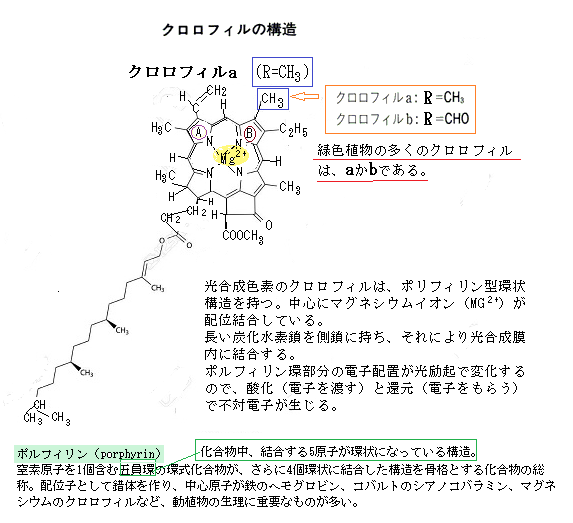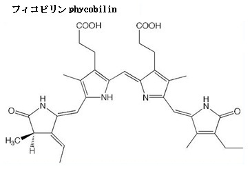 シアノバクテリアや藻類では、フィコシアニンはフィコビリソーム(光捕集複合体)の一部として働く。620 nm 付近の光を吸収し、650 nm の光では、「余剰エネルギーの漏れ」として蛍光を放つ。結果、必要なエネルギーだけを光合成反応中心へ効率的に伝達する。その蛍光は、光捕集の効率を測る指標として利用されている。 フィコシアニンはスピルリナの中に含まれる『青い宝石のような色素タンパク質』で、スピルリナはシアノバクテリアの一種で、淡水・汽水域に生息する地球最古級の生命体と言われている。タンパク質・ビタミン・ミネラル・抗酸化物質が非常に豊富で、「スーパーフード」と呼ばれる理由は、この総合的な栄養価の高さにある。 アロフィコシアニンallophycocyaninは、シアノバクテリアの光合成アンテナ『フィコビリソーム』のコア部分を構成する主要色素タンパク質で、フィコシアニンよりやや緑がかる青緑色、主に 赤色光(約650 nm)を吸収する。フィコビリプロテイン(光捕集色素タンパク質)の一種、発色団フィコビリンを持つ。フィコビリソームの中心部で、最終的に光エネルギーを光化学系 II に渡す。 フィコビリンphycobilinは、シアノバクテリア・紅藻・クリプト藻などが持つ水溶性の光合成補助色素で、タンパク質と結合してフィコビリプロテインを形成する。これらは光捕集アンテナ複合体フィコビリソームを構成し、クロロフィルが吸収しにくい波長の光を効率よく吸収する。外観の色は、赤・青緑・黄など。主な吸収光は、生物それぞれの種類による。 フィコエリスリンphycoerythrinは、緑光の光合成に関与する赤色のフィコビリタンパク質で、主に紅藻やシアノバクテリアに存在する。外観の色は、鮮やかな赤色から橙赤だが、緑〜黄緑光をよく吸収する。 紅藻やシアノバクテリアのフィコビリタンパク質の分子内には光合成でクロロフィルに光エネルギーを渡す補助色素C-フィコエリスリンやR-フィコエリスリンなど複数のタイプが含まれている。吸収極大は565 nm、蛍光極大は577 nm。天然の色素として食品や化粧品に使用されるほか、免疫測定のための試薬としても利用されるなど、諸研究においてもモデルタンパク質として利用される。 フィコエリスリンは、光合成においてクロロフィルに光を伝える役割を果たし、特に緑色の光を吸収しにくい植物にとって重要である。フィコエリスリンは、光合成において重要な役割を果たし、クロロフィルの酸素生成効率を高めることが知られている。つまり、フィコエリスリンは、クロロフィルが吸収できない波長の光を補完し、効率的にエネルギーを渡すことで酸素発生(O2 evolution)を強化する。 クロロフィル a は、 青色域と赤色域で強い吸収ピークを持つ。青色では、 約 430 nm 前後が 高エネルギー光で、励起効率が高い。赤色では、約 662〜668