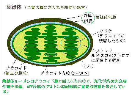 光合成の電子伝達反応に共役して、H+がチラコイドルーメンに輸送されるため、明条件ではルーメンはpH5くらいまで酸性化する。このルーメンのpH変化は、いくつかのタンパク質のプロトン化や、キサントフィルサイクル関連酵素の活性変化を引き起こし、光合成が光環境に応じて調節されるメカニズムの一端を担っている。 ルーメンに輸送されるタンパク質の多くは輸送後プロセシングを受け、そのためのプロテアーゼが存在する。ここでいう「プロセシング」とは、 タンパク質がルーメンに到達した後に受ける『切断・成熟化』のことで、具体的にはは前駆体タンパク質pre-proteinからシグナル配列を切断する タンパク質を正しい立体構造に整える。.また、 ジスルフィド結合の異性化など、機能発現に必要な修飾を行う これらの処理を行う。.このため.ルーメンには多種の酵素が存在する。 シトクロムb6f で電子は段階的にエネルギーを失いながら 銅タンパク質プラストシアニン(PC)に渡される。PC はチラコイド膜表面を滑るように移動し、PSI へ電子を届ける。. PSI(光化学系I)で再び光励起される。PSI の反応中心 P700 が光を吸収し励起(P700*)する。 P700* は電子を失うと、PC から電子を受け取って補う。P700* から放出された高エネルギー電子は、還元型フェレドキシン(Fdred)に渡される。 フェレドキシン(Fdred) → FNR → NADP+還元 フェレドキシン(Fdred)は、電子を『フェレドキシン-NADP+レダクターゼ(還元酵素FNR)』に渡す。FNR は、 「光合成電子伝達系の最終ステップで、電子を NADP+に渡して NADPH を作る酵素」 であり、 生命の還元代謝を支える中心的な電子変換装置である。シアノバクテリアや植物葉緑体のチラコイド膜および根の色素体plastidに存在し、還元型フェレドキシンによるNADP+の還元によりNADPHを生成するのに必要な可溶性酵素であり、次の反応を可逆的に触媒する。 FNR は電子とプロトン(H+)を使って 、 2分子の還元型フェレドキシン(Fdred) + NADP+ + H+ ⇔ 2分子の酸化型フェレドキシン(2Fdox) + NADPH NADPH はカルビン回路で CO2 を還元し、糖を作るための『還元力の通貨』として働く。 水の分解で生じたプロトンH+は、ストロマ側からルーメン側へ 汲み上げられた後に、ATP合成酵素がATPを作るためのプロトン勾配を形成する。 目次へ |