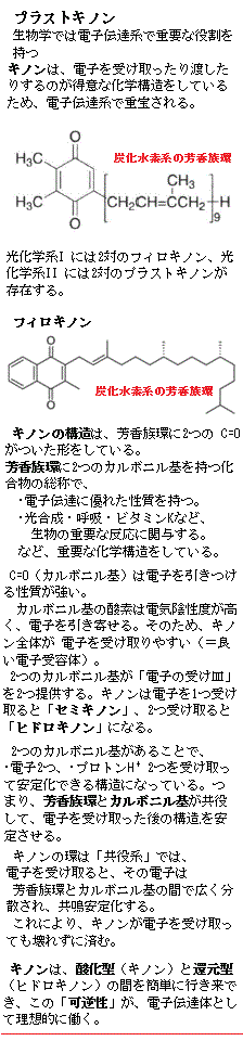 | 1)シアノバクテリアと『緑の海』との共進化 原生代Proterozoic Eonは、地球の歴史における4つの地質学的永劫のうち最も長い時代区分であり、25億年前から約5億4,100万年前にあたる地質時代である。それには冥王代と太古代が先行し、先カンブリア紀の累代の最後の部分である原生代の後にカンブリア紀から始まる顕生代が続く。 原生代の開始の『25億年前』は、明確な地質学的境界がないため、1981年に国際的に扱いやすい便宜的・実務的な「標準値」として25億年が採用された。これは、太古代と原生代の境界に、顕生代の開始のような「世界的に同時に起こった化石の変化」などのような明瞭な地質学的指標が存在しなかったためであった。 名古屋大・京大・東北大などの研究チームでは、原生代の海の光環境を再現し、次のような結論に至っている。当時の地球は酸素がほとんどなく、海には還元状態の二価鉄(Fe2+)が大量に溶け込んでいた。やがてシアノバクテリアによる光合成で生まれた酸素が鉄を酸化し、微細な酸化鉄(FeO・Fe2O3)が海中に漂った。この酸化鉄の粒子は、紫外線や青い光を強く吸収する。また、水そのものは赤い光を吸収する性質がある。残るのは緑、その結果、海は緑色の光を吸収せずに反射するため、緑色に輝いていたと見ている。 最新の研究では、シアノバクテリアは、太古の海が緑色の光で満たされていた環境で、その光を効率よく吸収する光アンテナ(フィコビリンphycobilin)を進化させ、繁栄していたことを示す。 フィコビリンは、シアノバクテリアが持つ光捕集色素で、フィコビリソームphycobilisomeというアンテナ複合体の中に組み込まれている。進化させたフィコビリンにより、光エネルギーの吸収範囲を広げた。フィコビリンは 赤・橙・黄・緑(520〜630 nm)の光を効率よく吸収する。これらの波長はクロロフィルaが苦手とする領域なので、シアノバクテリアはより広い光環境で光合成できるようになった。 (クロロフィルaは、可視光のうち青色域の吸収ピークは430nm前後 と 赤色域の吸収ピークは、約662nm前後の光を強く吸収する。クロロフィルaは、青と赤の光を強く吸収し、緑の光をほとんど吸収しないため、植物は緑色に見える。) フィコビリンはフィコビリプロテインphycobili proteinと言うタンパク質と結合し、光捕集アンテナphycobilisomeを形成する。ここで吸収した光エネルギーは、効率よく光化学反応中心((光化学系II;photosystem II【PSII】など)へ転送される。PSIIは光合成の中で、光をエネルギーに変換する最初のステップで、水を酸化して電子を取り出す能力があり 水 → 電子 + プロトン (H+) + 酸素(O2) ここで生じる酸素が、地球の大気を満たすO2の源であり、励起された電子はプラストキノンplastoquinone(PQ)へ渡され、失われた電子は水の分解で補われる。プラストキノンは、植物や藻類の光合成で使われる重要な電子運搬体で、特にPSIIから電子を受け取り、次のシトクロムb6f複合体へ運ぶ役割を担っている。また酸素を生み出す唯一の装置であり、ATPとNADPH生成の起点となる電子を供給する中心的存在と言える。 シトクロムb6fは、PSIIでプラストキノン(PQ)が 2つの電子と 2つのプロトン(H+)を受け取って還元されたプラストキノールplastoquinol(PQH2)から電子を受け取り、PSIへ渡す中継点であり、これにより、光合成の二つの光化学系が一つの流れとして結び付く。 プラストキノンは、葉緑体やシアノバクテリアが持つ主要キノンで、この光合成の電子伝達に関わる炭化水素系の芳香族環は、化学的に非常に頑丈で、繰り返しの酸化還元に耐えられる。また、芳香族環は「疎水性」で膜中を移動しやすい。生体内のキノン(ユビキノン、プラストキノン)は、電子伝達系でミトコンドリア内膜やチラコイド膜の中を横方向に移動する。この移動には 疎水性の炭化水素環が重要で、そのため膜の中を自由に動ける。 つまり、炭化水素系の芳香族環は、電子伝達のための化学的安定性が高く、また膜中移動のための物理的特性の両方を満たす、非常に合理的な構造になっている。 酸化型プラストキノン(PQ)→セミキノン(キノン類の中間の酸化段階にある遊離基)→還元型プラストキノール(PQH2)と変化しながら電子とプロトンH+を運ぶ。特に PQ-9(プラストキノン9)が主要成分で、PSIIの2つのプラストキノン電子受容体QA(一次電子受容体)・QB(二次電子受容体)部位で電子受容体として働く。 QA(一次電子受容体)は、PSII の最初の安定な電子受容体で、化学的本体は プラストキノン(PQ)であり、電子だけを受け取るタイプ(1電子酸化還元)で、D2タンパク質に結合している。 D2タンパク質は、光エネルギーを効率的に捕集するための補助色素と結合し、光合成反応において重要な役割を果たしている。D2タンパク質は、光化学系Ⅱの二次電子供与体として機能し、光化学系Ⅱの酸化還元反応に関与する。D2タンパク質のアミノ酸配列はD1タンパク質と相同性が高く、構造的にも機能的にもD1タンパク質との類似性がきわめて高い。 (光化学
