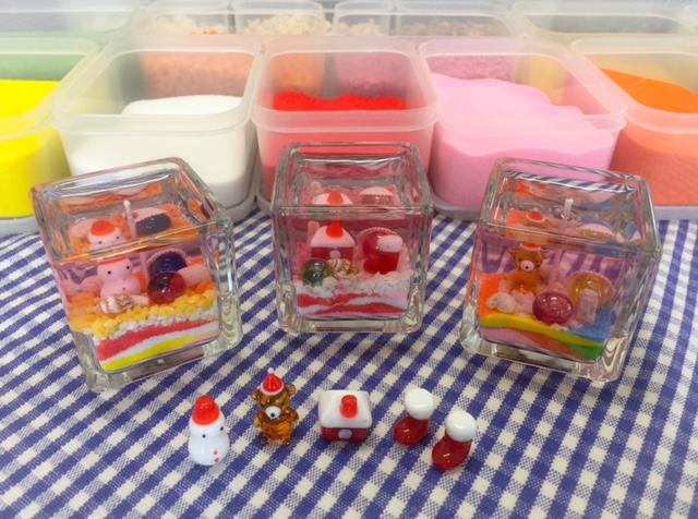 グラスにパステルカラーサンドをしきつめ