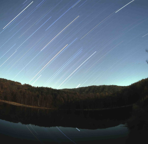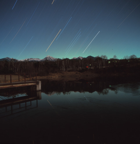 水面に映る星の軌跡が