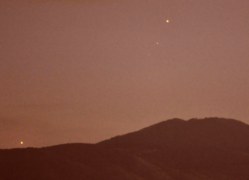 夕焼けの中の4惑星と月を撮影。