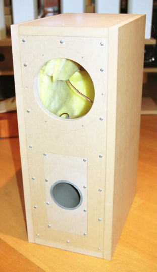 | この作品はビスケットジョイントで組み立ててあります。 オプション2と4を組み込んで組み立てた状態です。 左写真の吸音材/ケーブル/端子は価格に含みません。 |