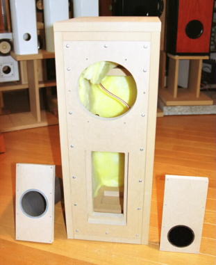 バスレフダクト取り付け用のサブバッフルを 2種類用意した様子です。 ダクト径2種類と各々取付位置を変えてありますので ユニット−ダクト−床の間の干渉も確認できます。 |